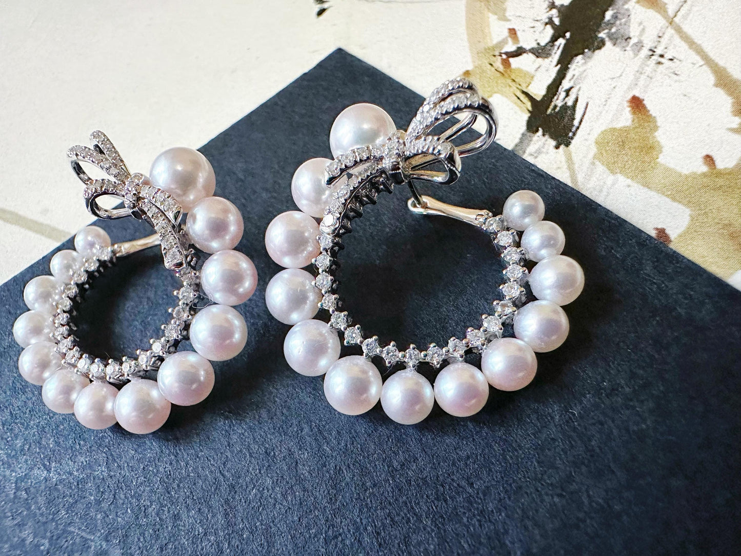 Akoya Pearl Hoop Earrings – 18K White Gold Diamond Ribbon Design Hoops
