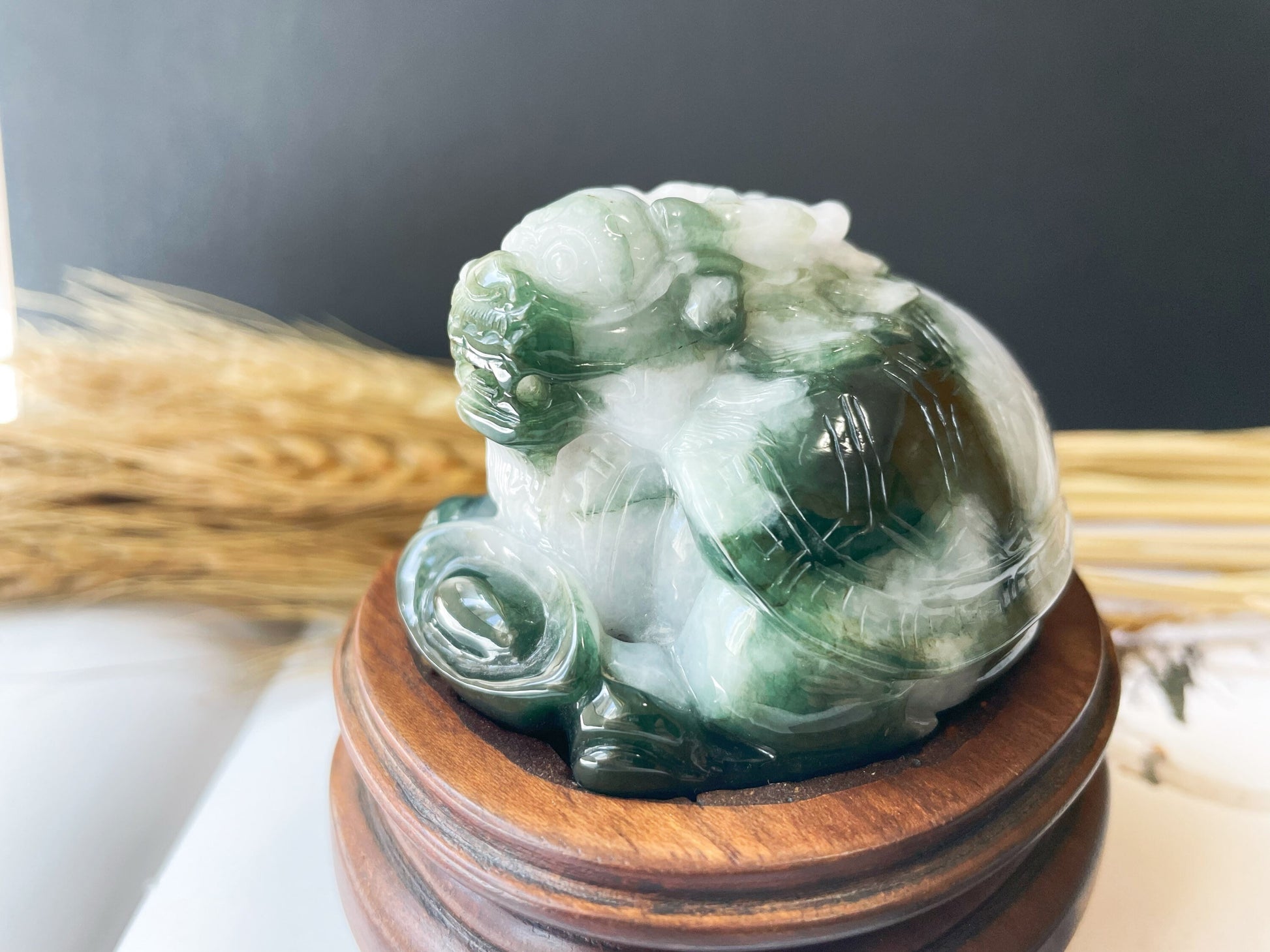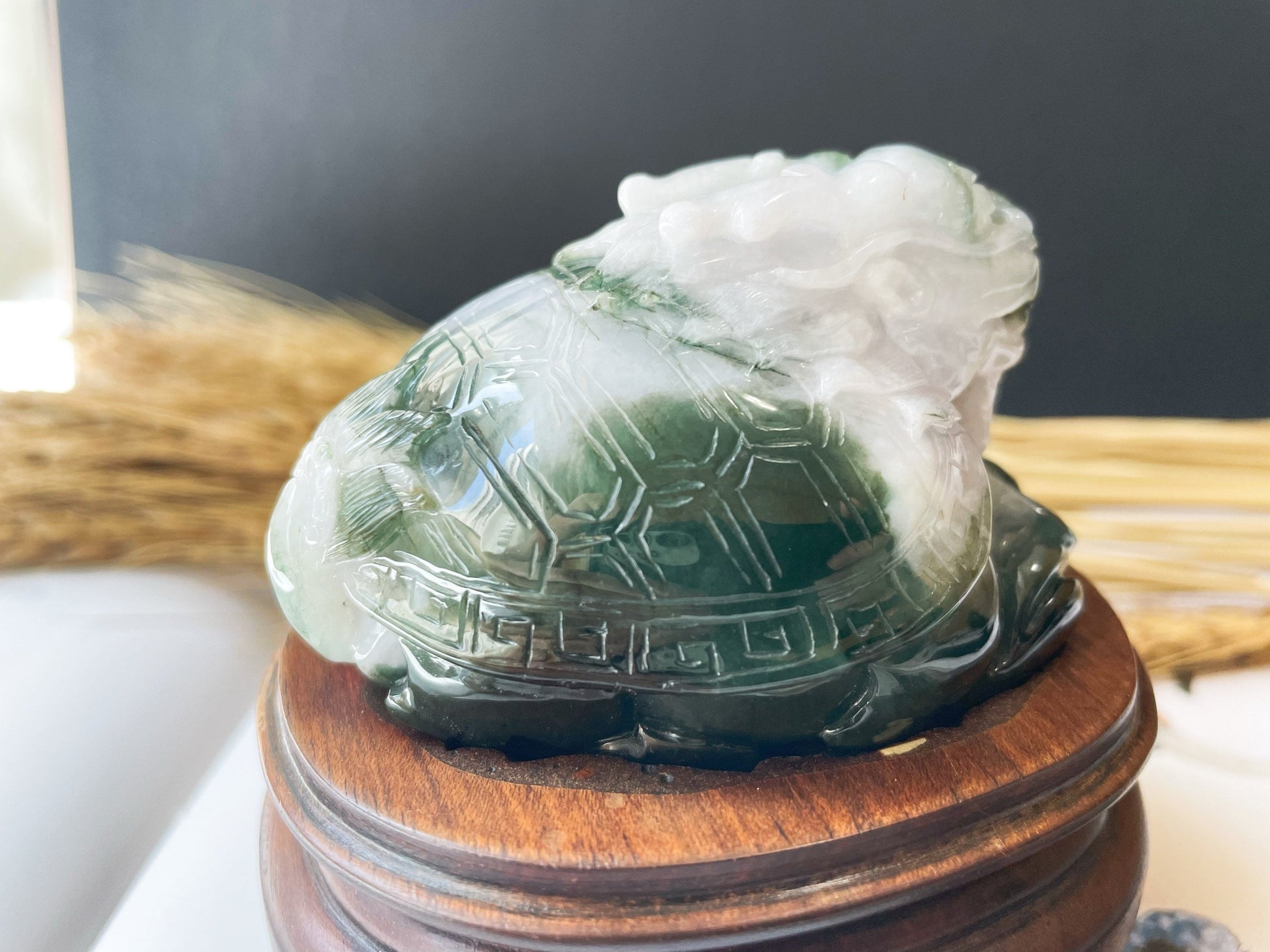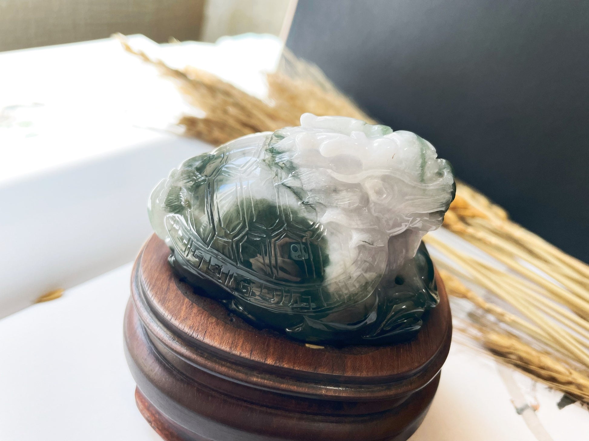 Cette tortue dragon est fabriquée à la main à partir de jadéite du Myanmar de type A 100 % naturelle, non traitée et non teinte. La belle texture fine et cireuse offerte par Mère Nature rend cette jadéite unique et attrayante. Cette jadéite a une texture fine et un éclat vitreux. Le sens du toucher est cool.