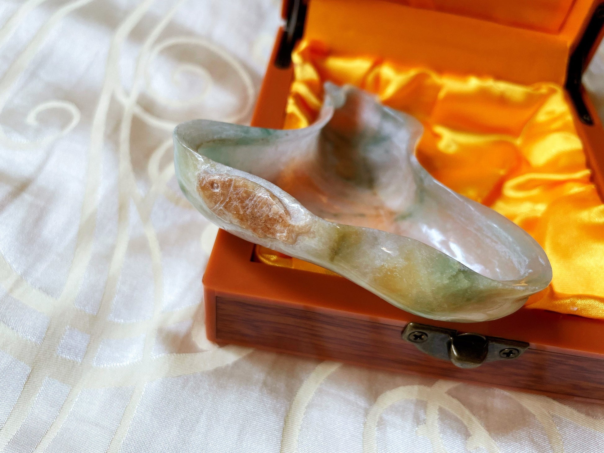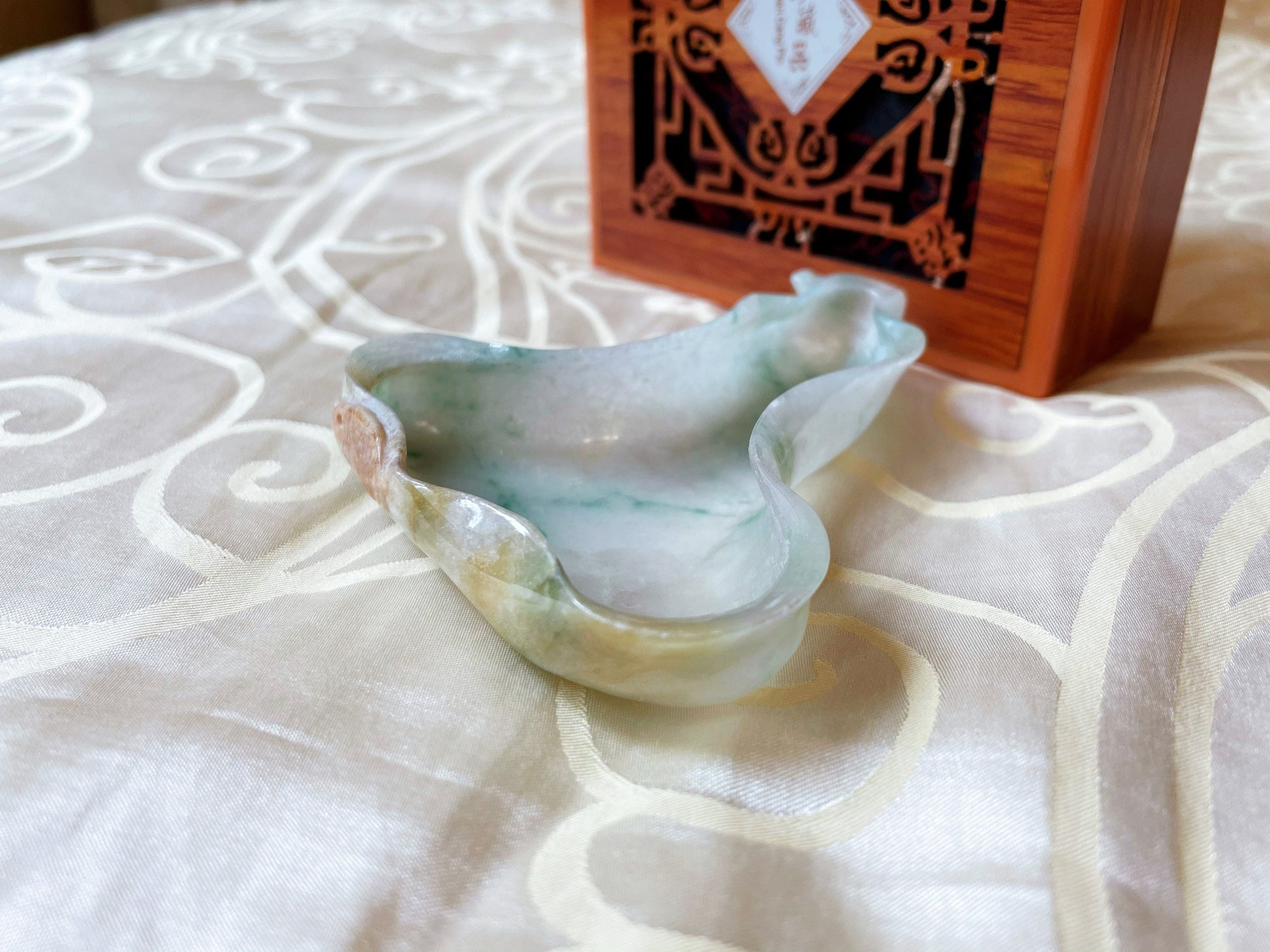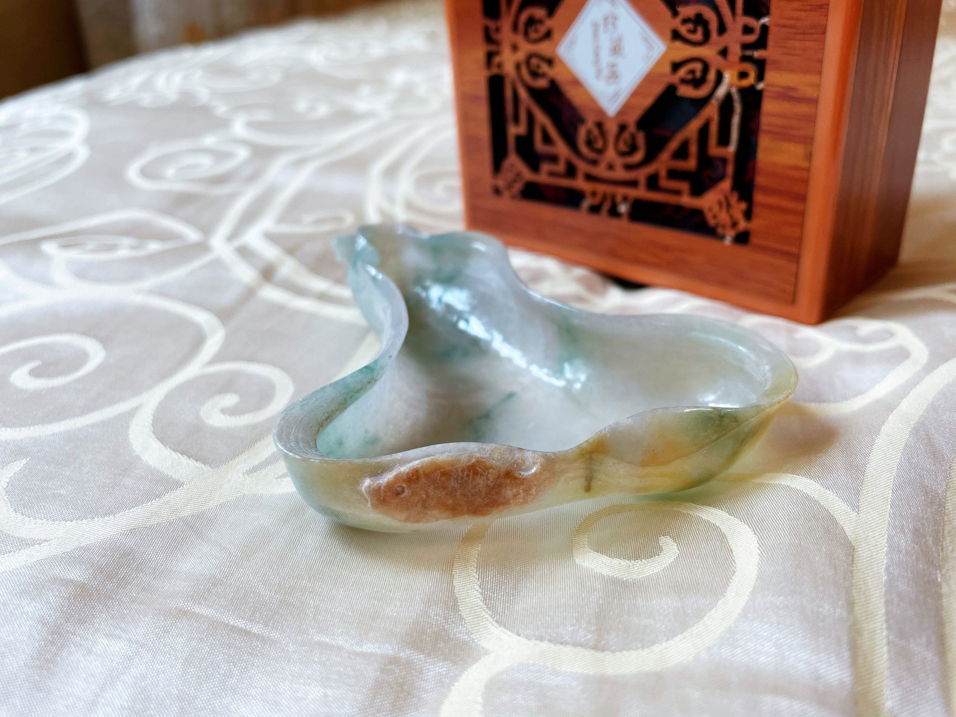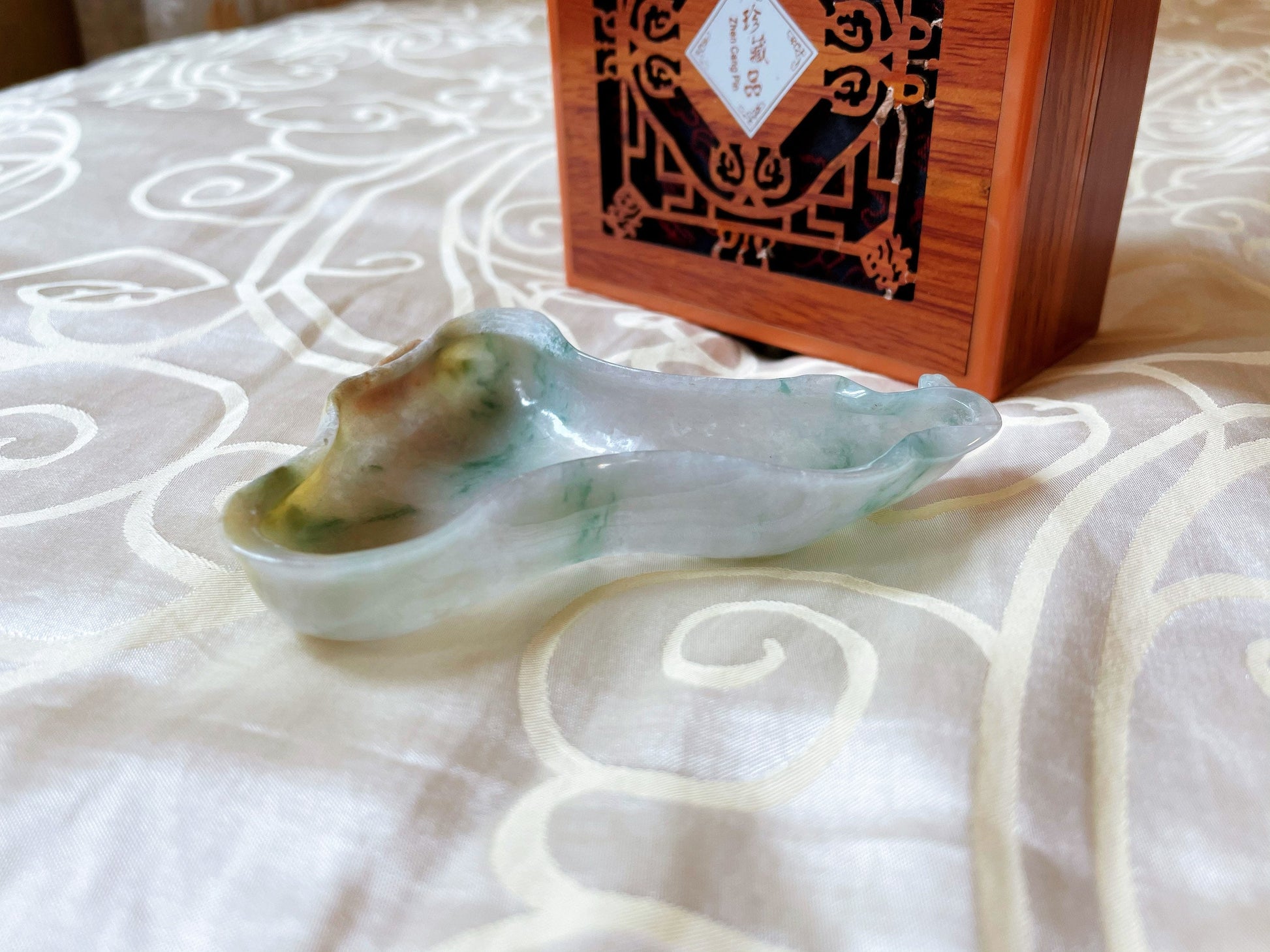 Ajoutez une touche d'élégance à votre pratique de la calligraphie avec cette superbe plaque à encre, sculptée à la main selon des techniques traditionnelles à partir de jadéite verte naturelle du Myanmar de type A. Chaque assiette est unique en son genre, avec un motif tricolore unique qui est tout simplement fascinant. La texture fine et l'éclat vitreux de la jadéite créent une surface fraîche et lisse qui est luxueuse au toucher.