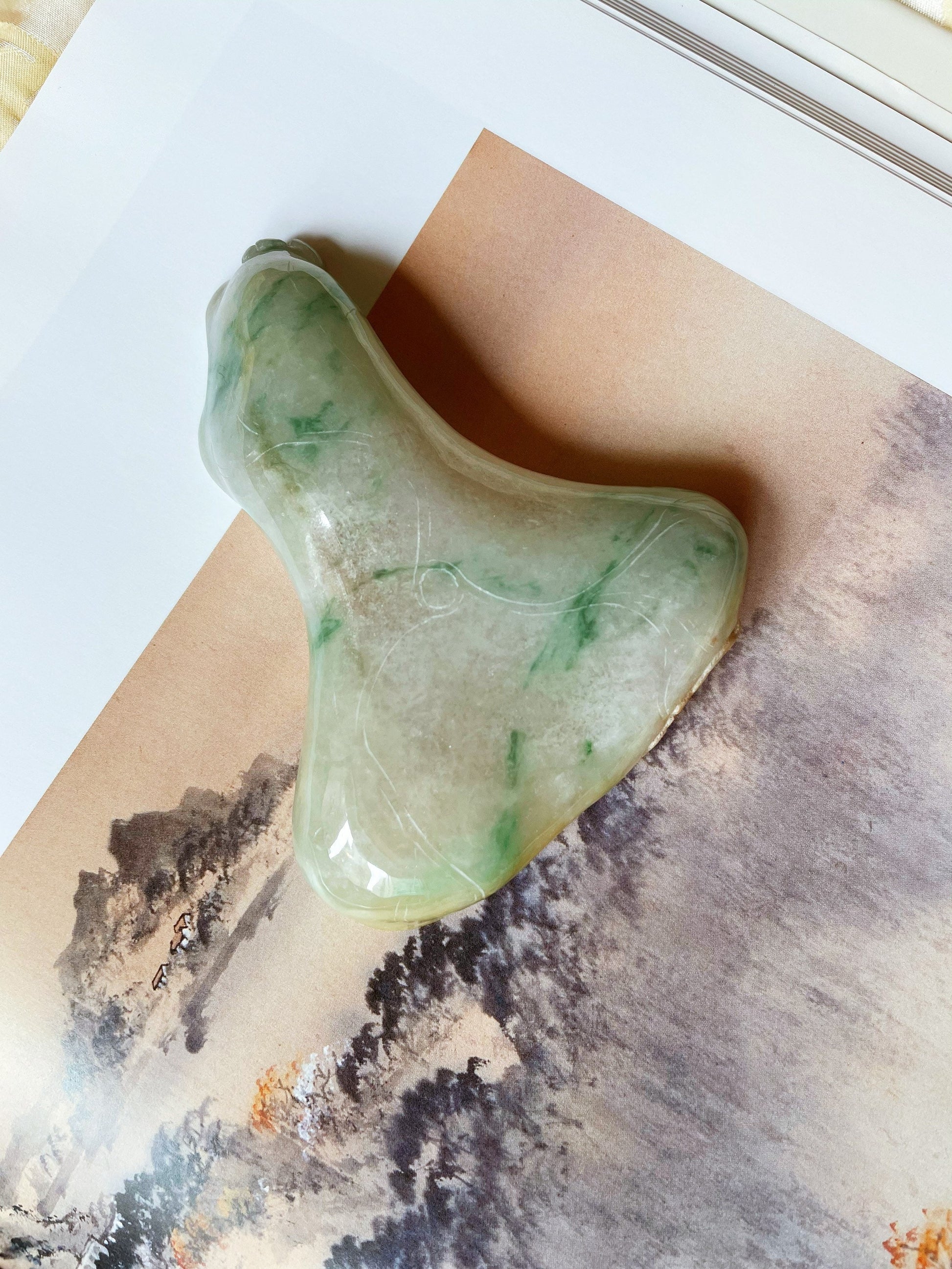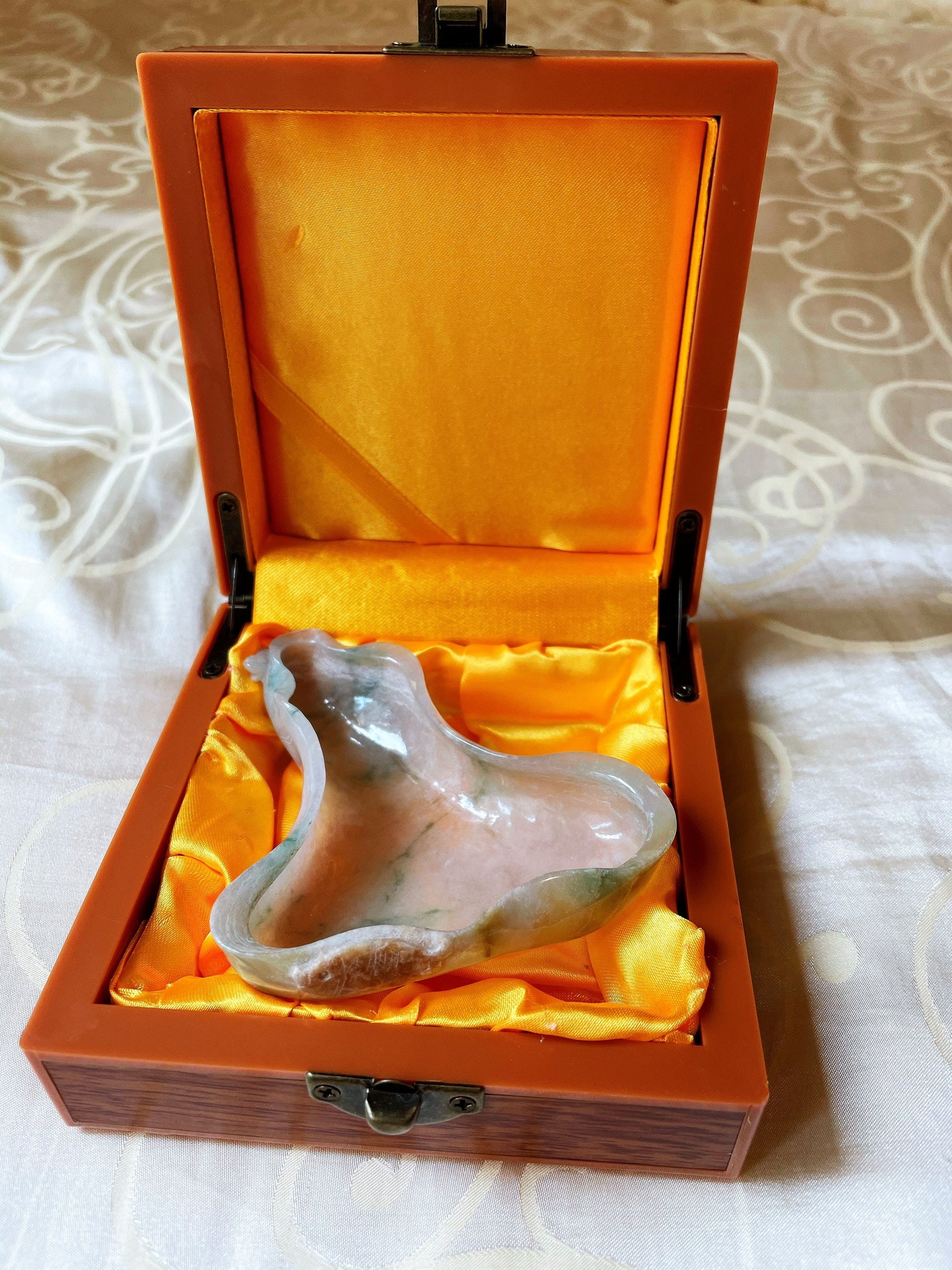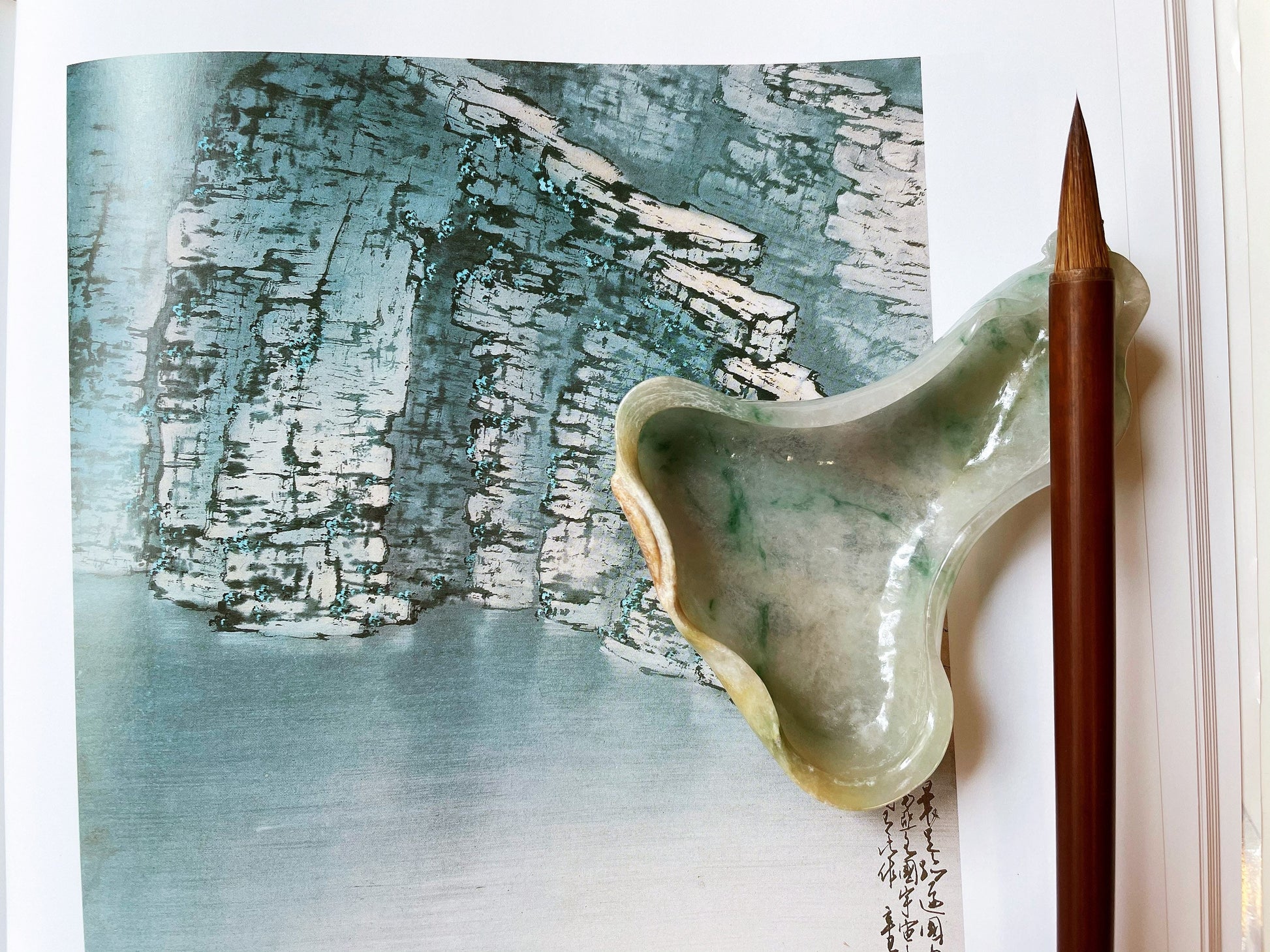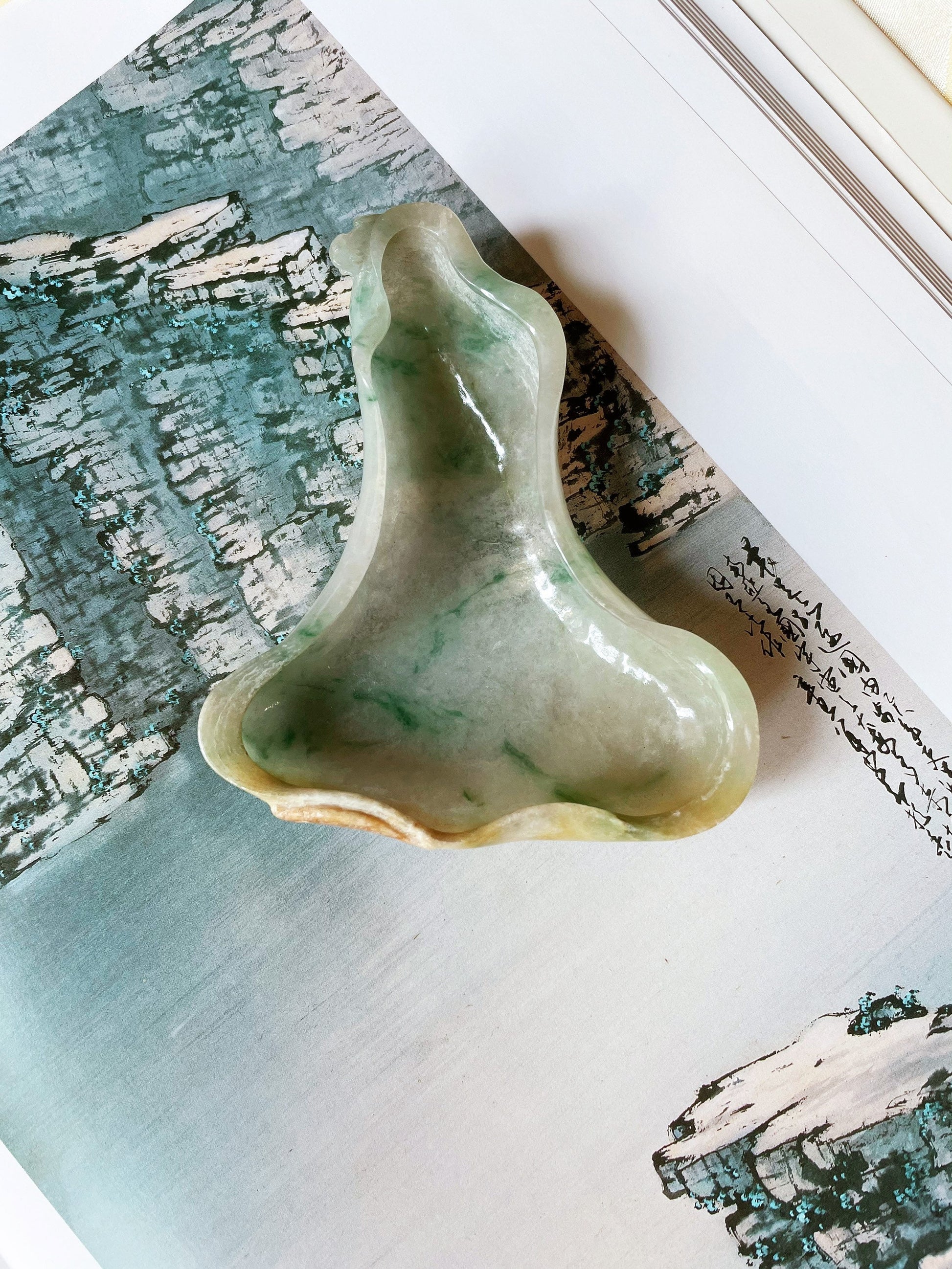 Ajoutez une touche d'élégance à votre pratique de la calligraphie avec cette superbe plaque à encre, sculptée à la main selon des techniques traditionnelles à partir de jadéite verte naturelle du Myanmar de type A. Chaque assiette est unique en son genre, avec un motif tricolore unique qui est tout simplement fascinant. La texture fine et l'éclat vitreux de la jadéite créent une surface fraîche et lisse qui est luxueuse au toucher.