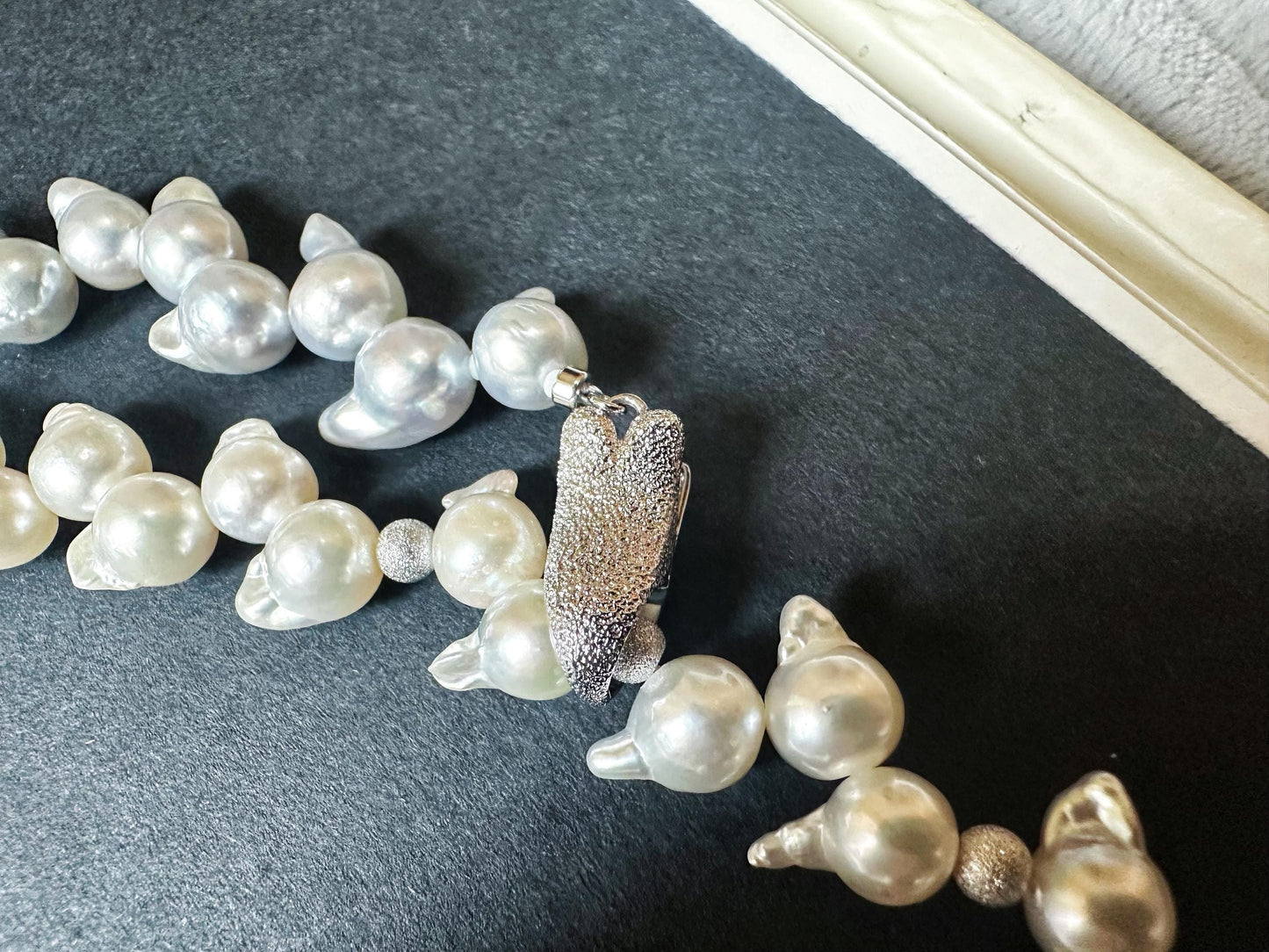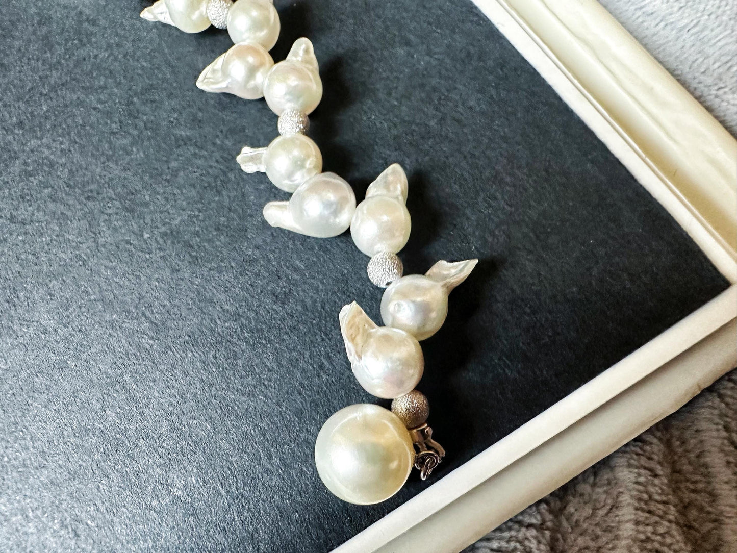 ◆ Unique Design: The necklace artfully showcases a combination of drop-shaped or wheat-shaped akoya pearls, with half of the strand featuring pristine white pearls and the other half featuring exquisite grey pearls, each enhanced by a subtle blue tint. This distinctive design makes it a one-of-a-kind piece that stands out.