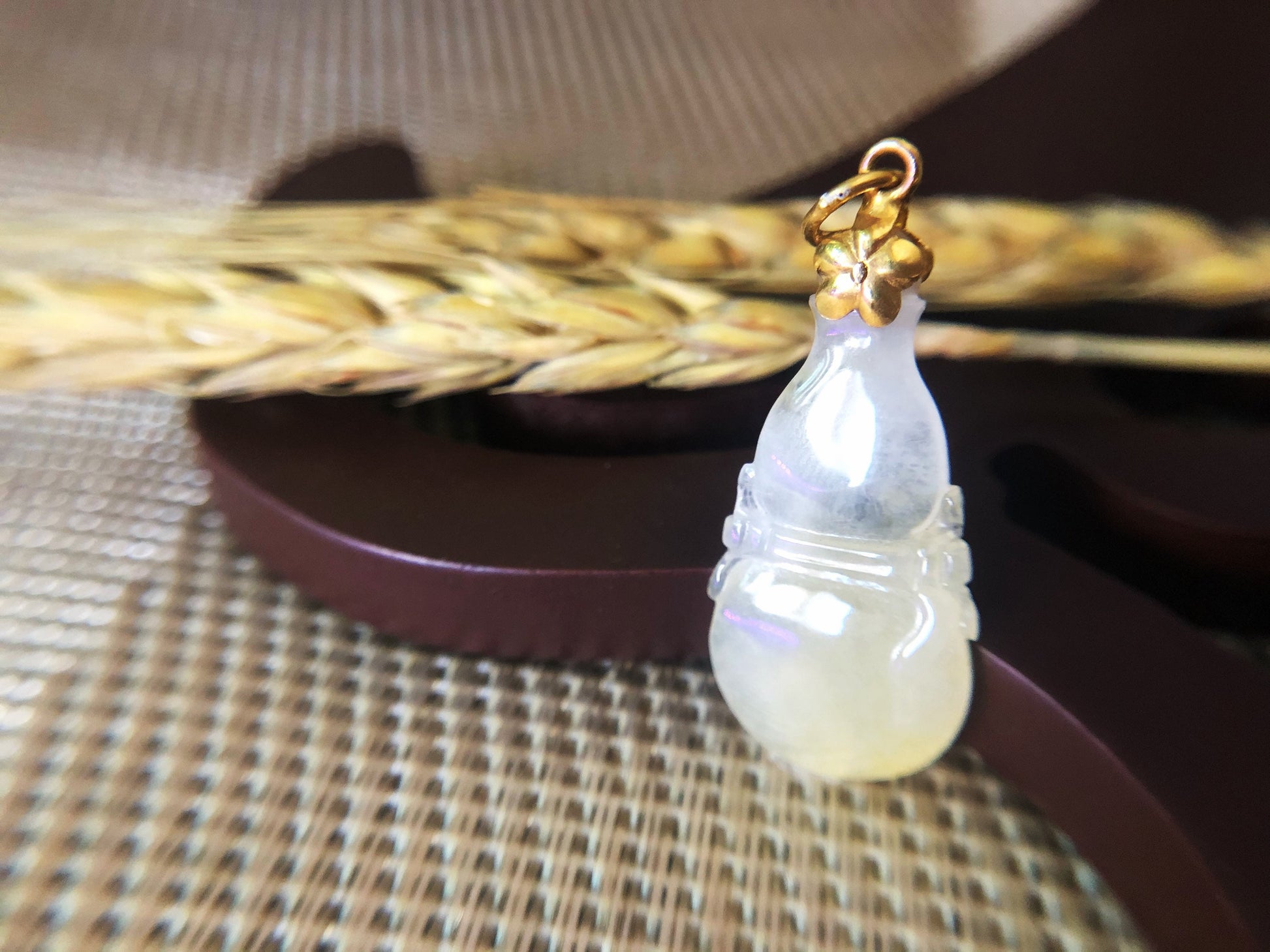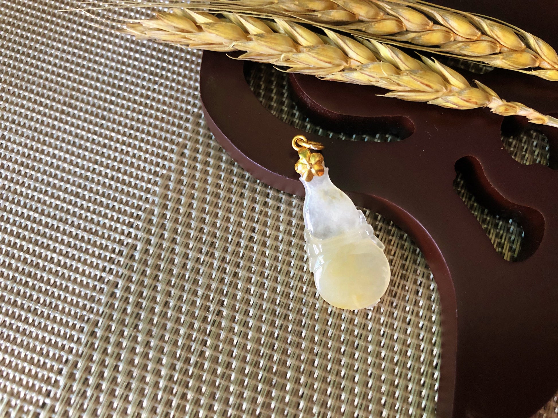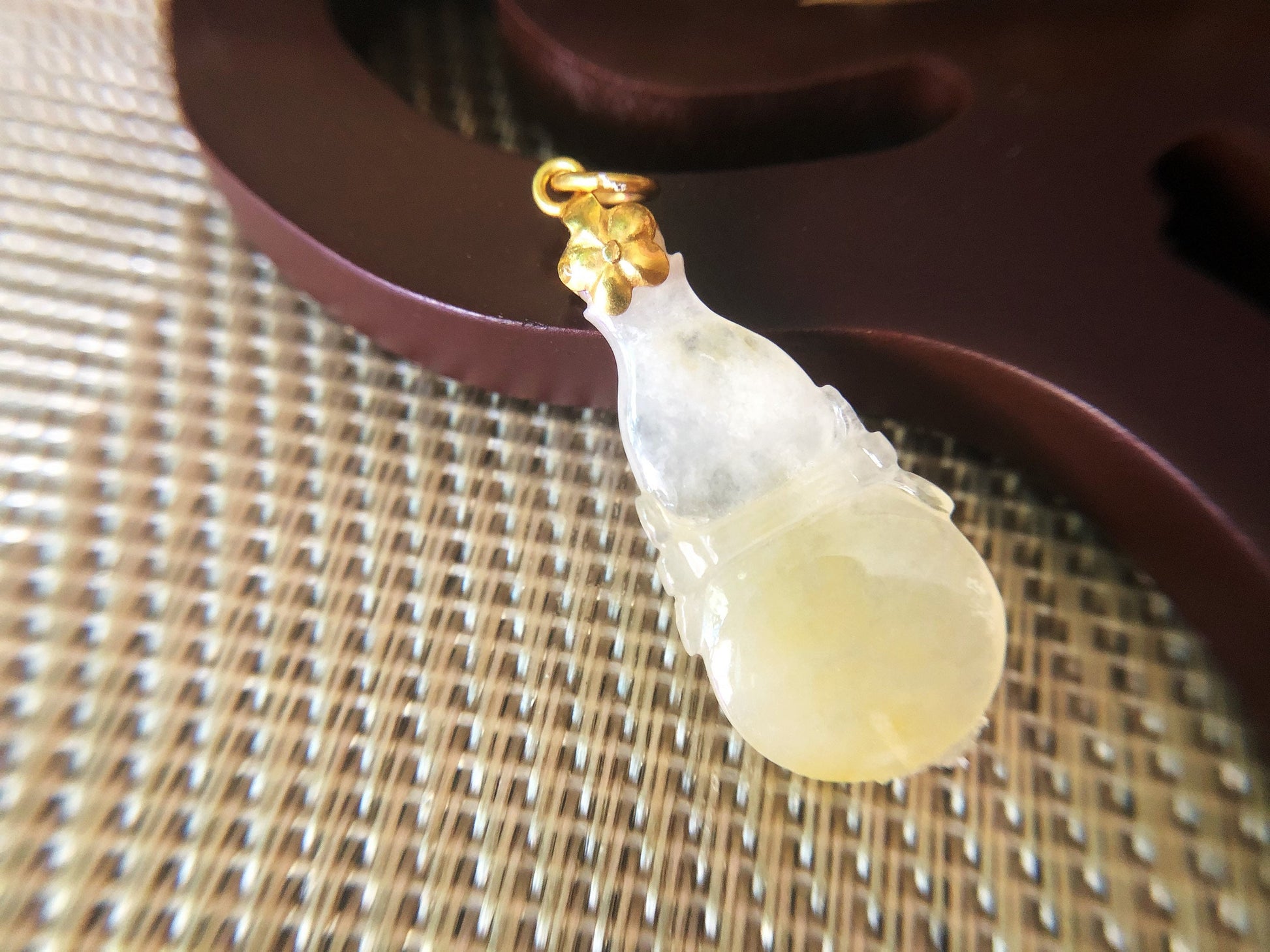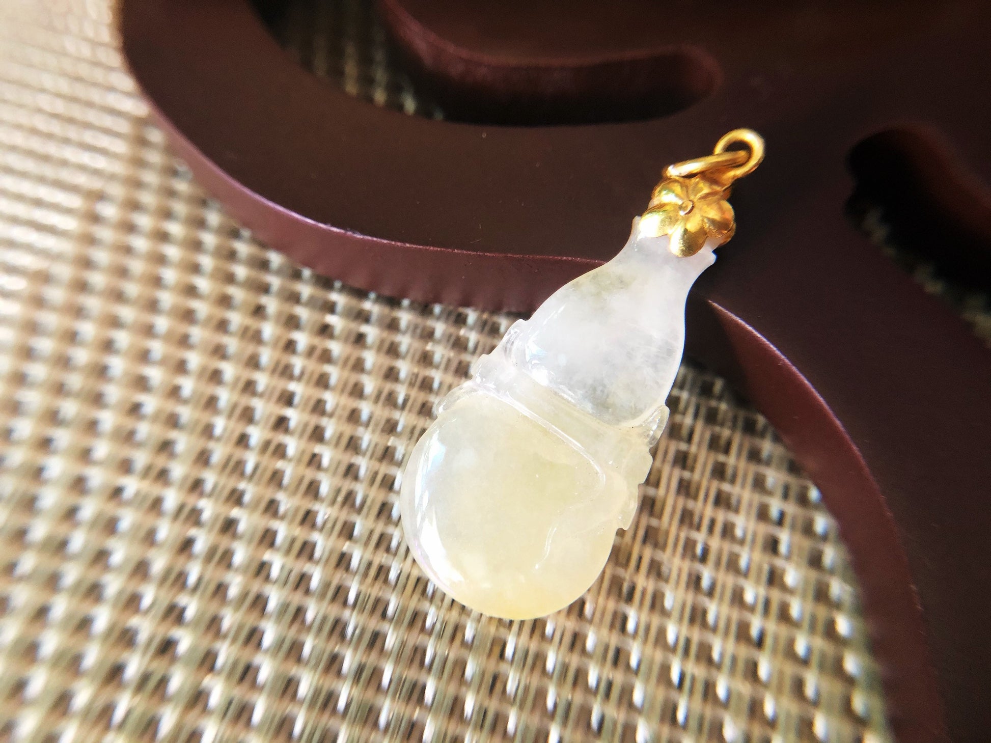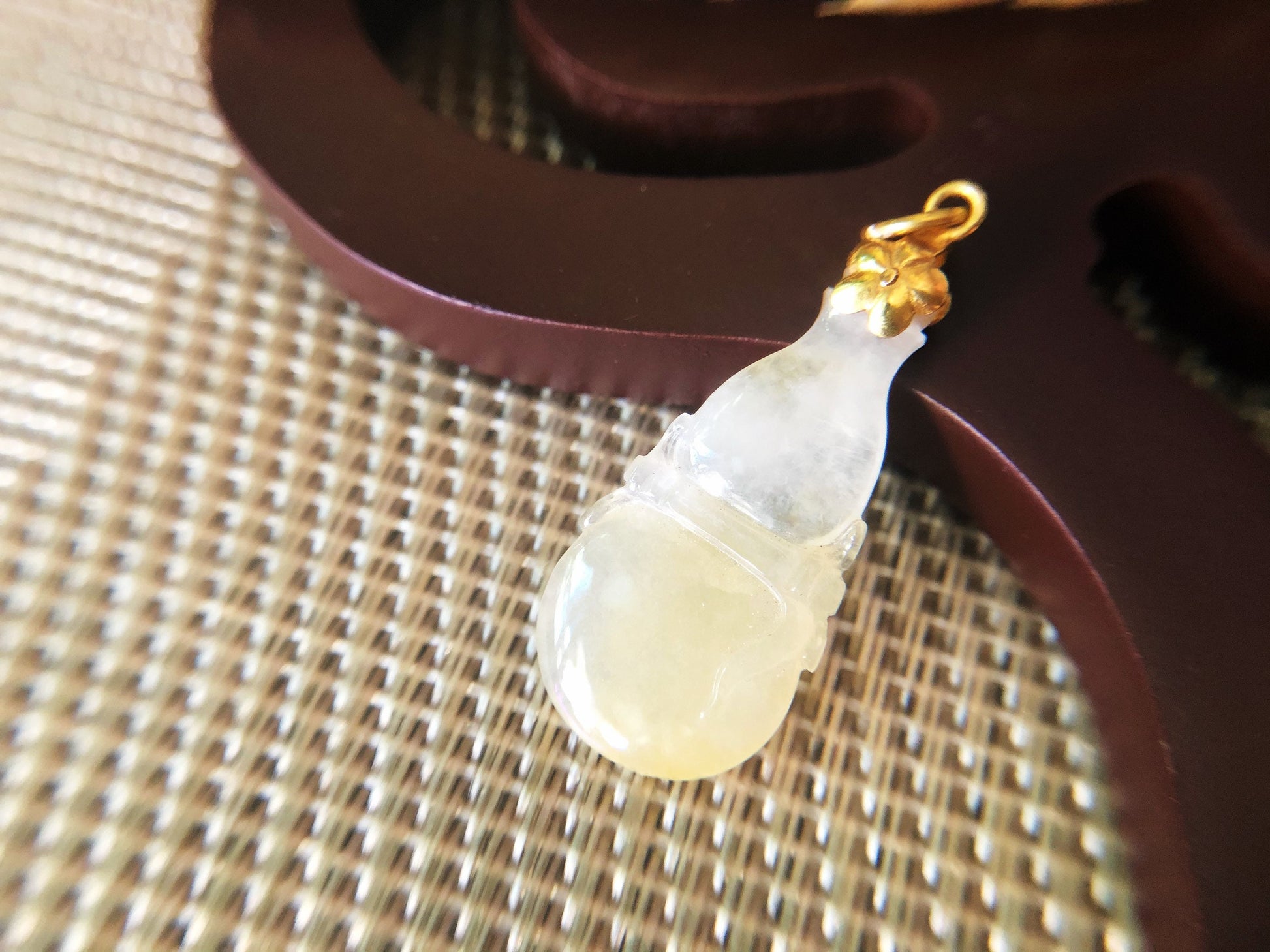 Indulge in the natural beauty of this stunning hand-carved calabash-shaped jade pendant, made from 100% natural, untreated, and undyed icy Type-A Myanmar jadeite jade. The rarity and natural beauty of icy jadeite make it one of the most valuable and sought-after gemstones in the world, prized for its quality and brilliance. This pendant boasts a beautiful yellowish patch gifted by Mother Nature herself, making it a unique and attractive piece. Its fine texture and vitreous luster give it a luxurious feel, while its cool touch adds to its appeal.