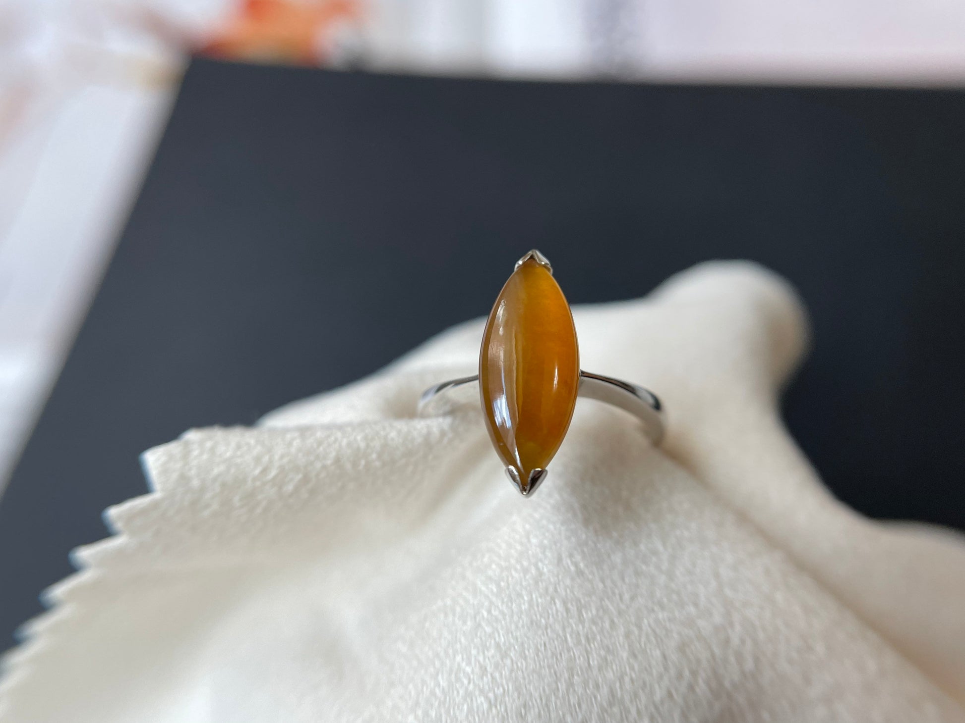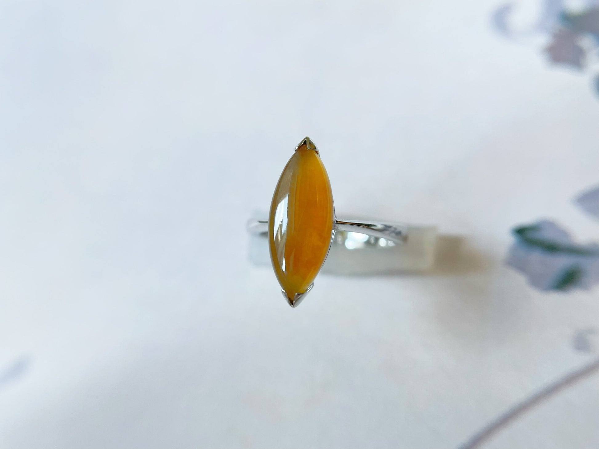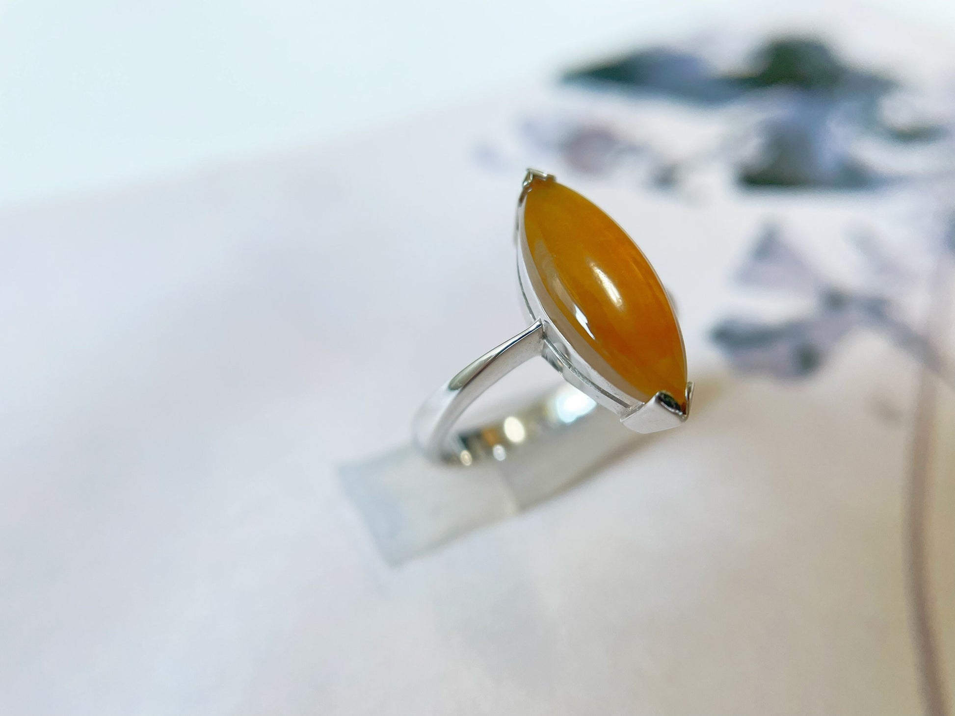 Looking for a luxurious and unique piece of jewelry that combines the natural beauty of jadeite with the elegance of white gold? Feast your eyes on this exquisite ring, featuring a hand-carved Type A Myanmar natural honey yellow marquise jadeite set in 18K white gold.