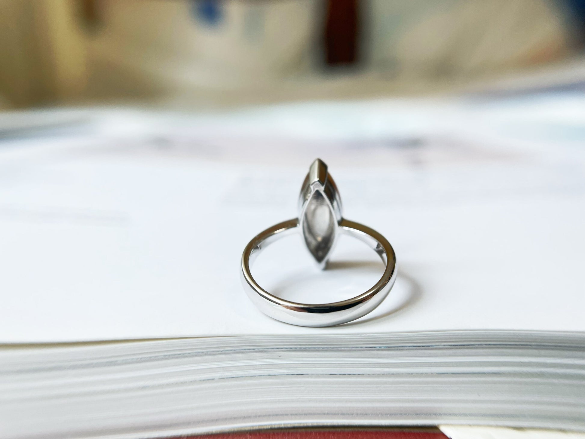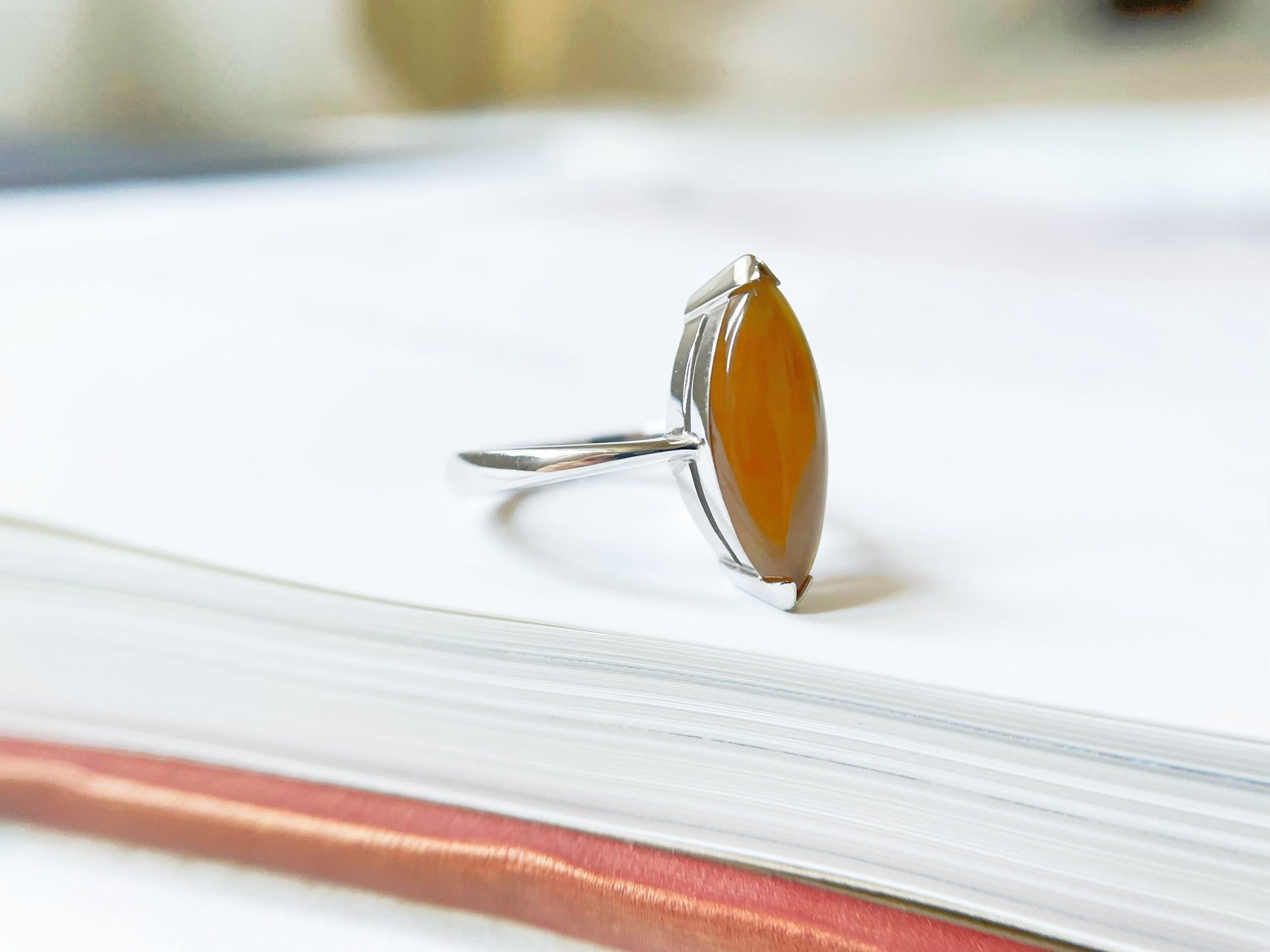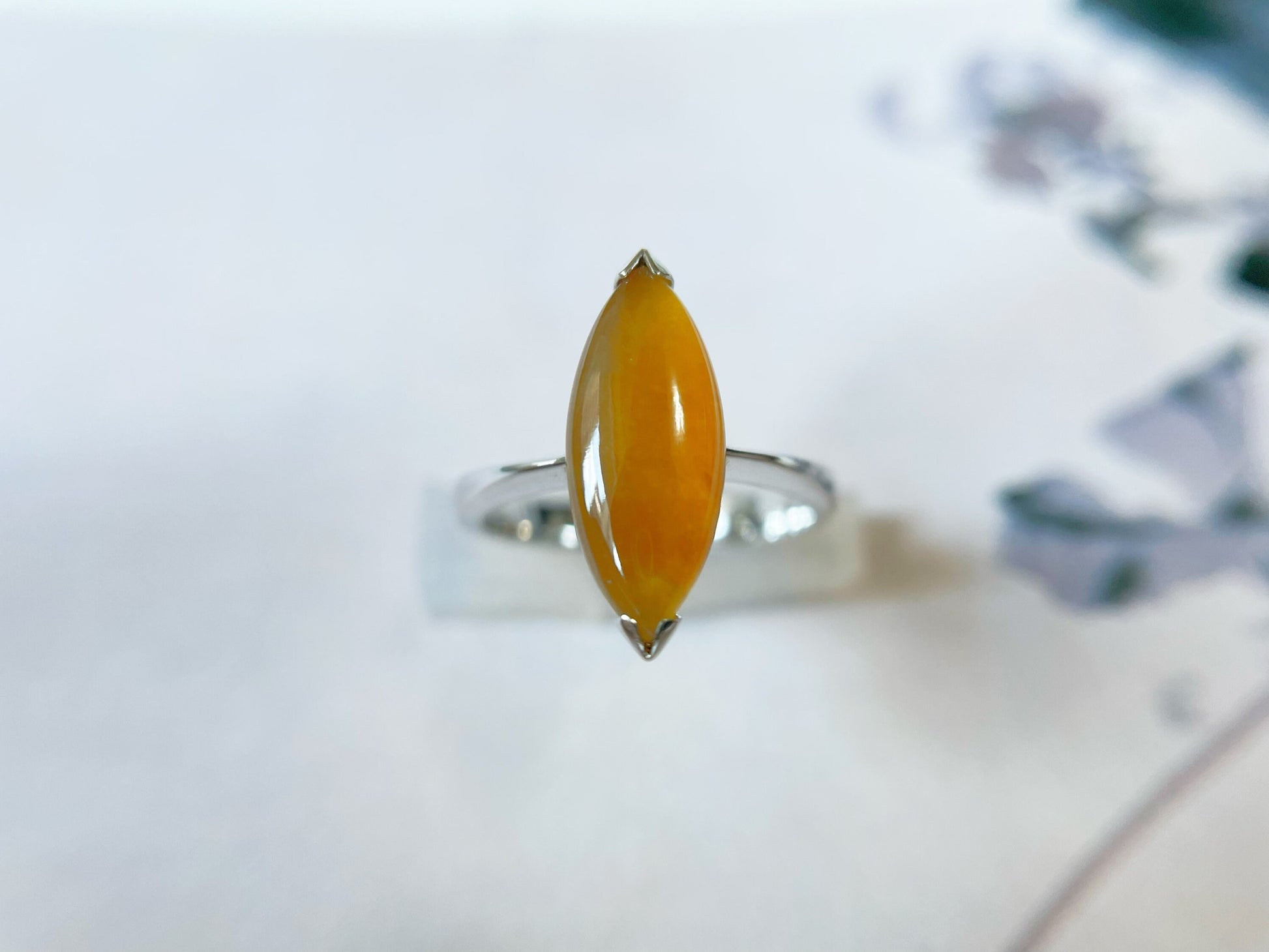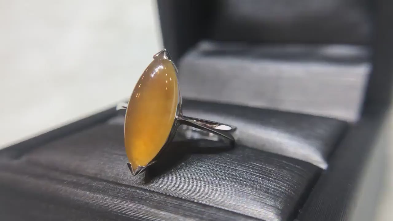 Looking for a luxurious and unique piece of jewelry that combines the natural beauty of jadeite with the elegance of white gold? Feast your eyes on this exquisite ring, featuring a hand-carved Type A Myanmar natural honey yellow marquise jadeite set in 18K white gold.