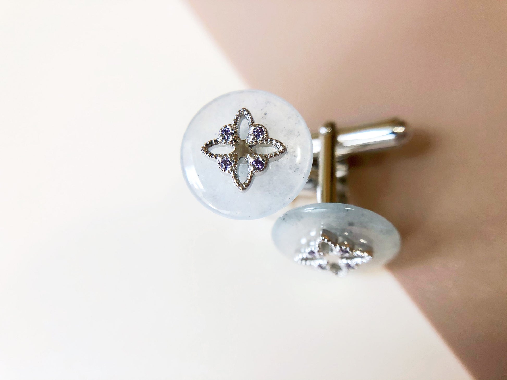 Capture the attention of everyone in the room with these stunning cufflinks, crafted from Type A natural Myanmar jadeite gemstones. The icy translucent jadeite and purple zircons are custom-designed and set in 925 silver plated with 18K white gold. These one-of-a-kind cufflinks are perfect for both daily wear and special occasions, making them a versatile addition to any jewelry collection.