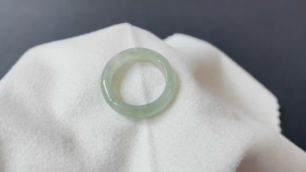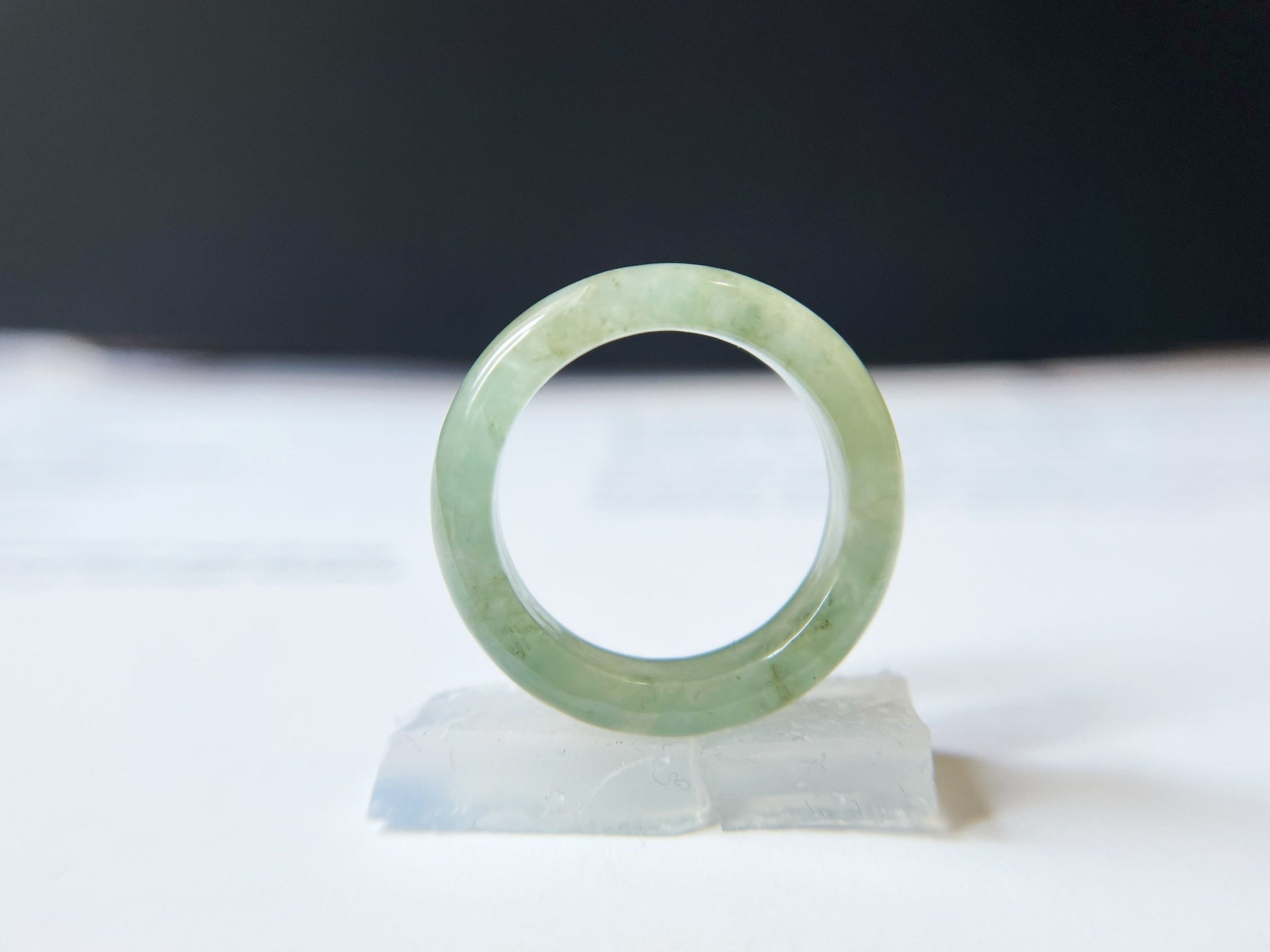 This jadeite band is 100% natural, untreated and undyed Type-A Myanmar jadeite jade. It is hand-carved. Its bluish-green color is unique. The ring has a fine texture and vitreous luster. The sense of touch is cool.